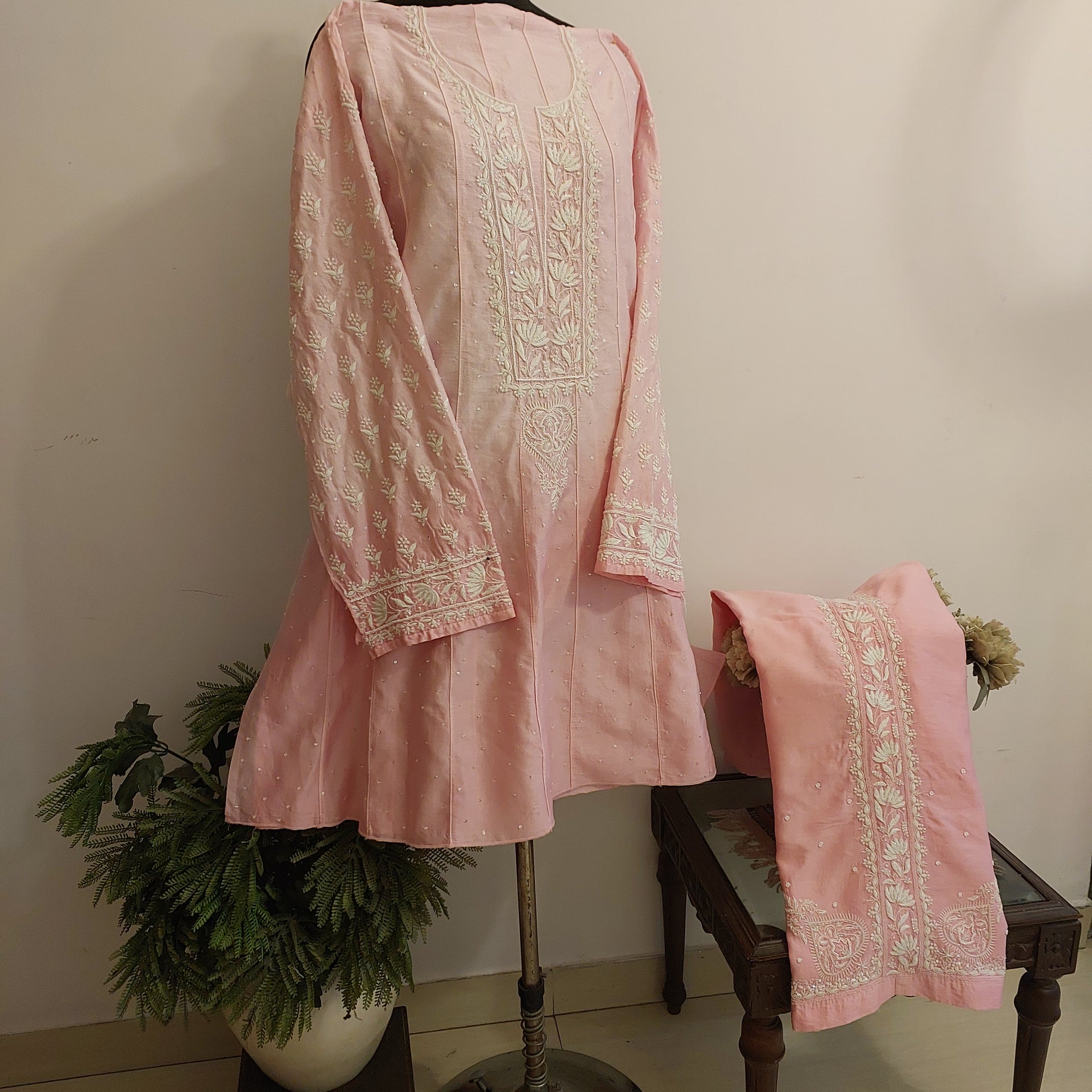 Pure chanderi silk semistiched anarkali coord set dyed to ombre color.its completely handcrafted in chikankari with embellishments.