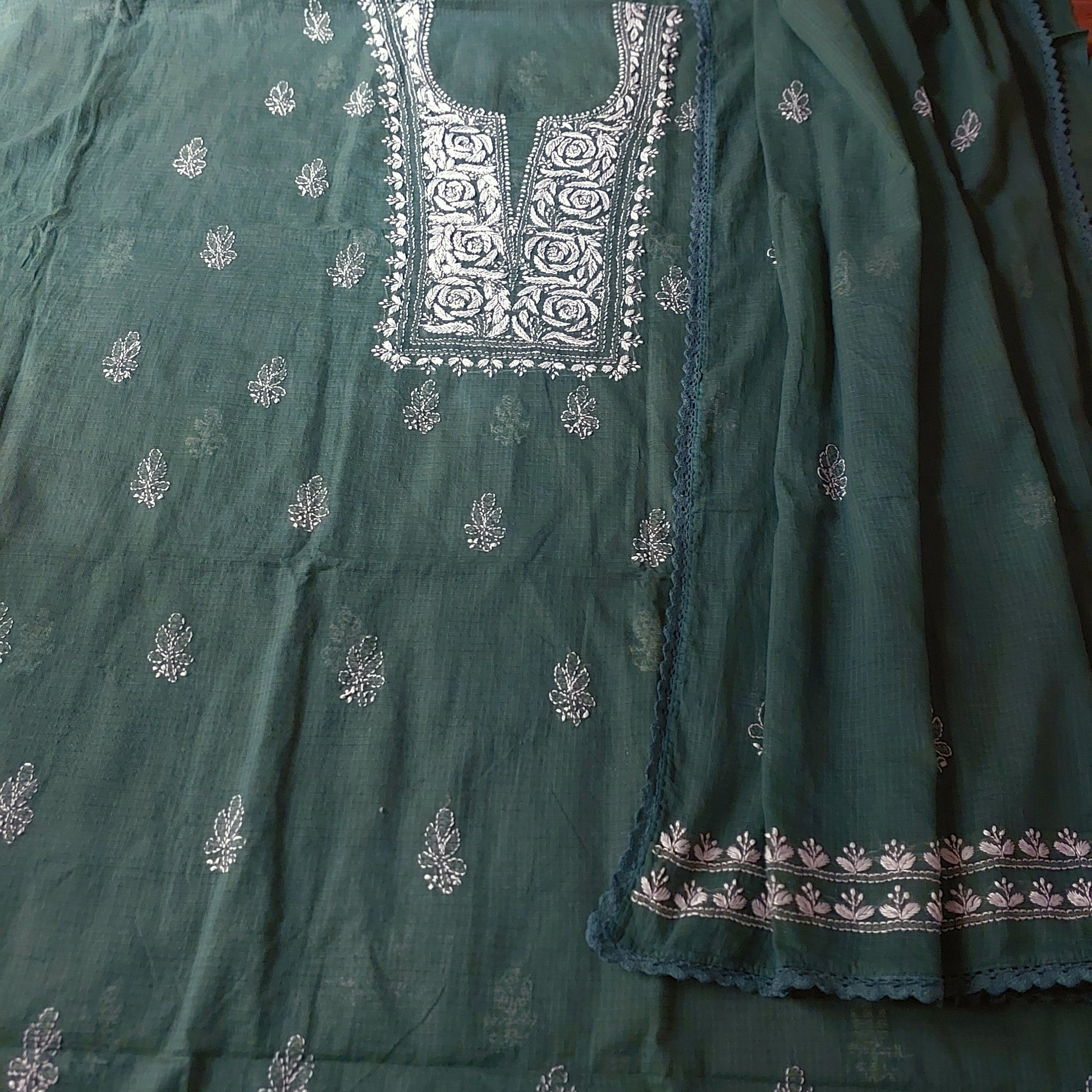 Kota Doriya Rose Chikankari (Bottle Green)