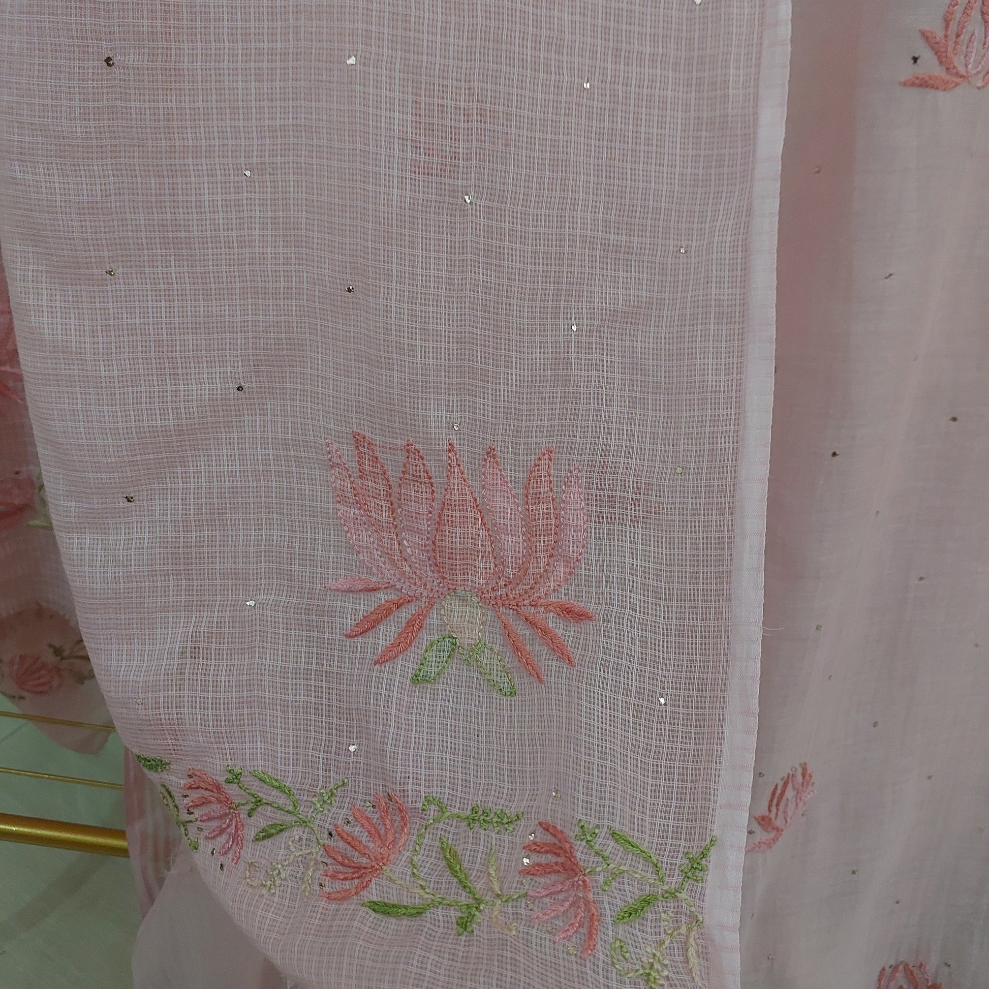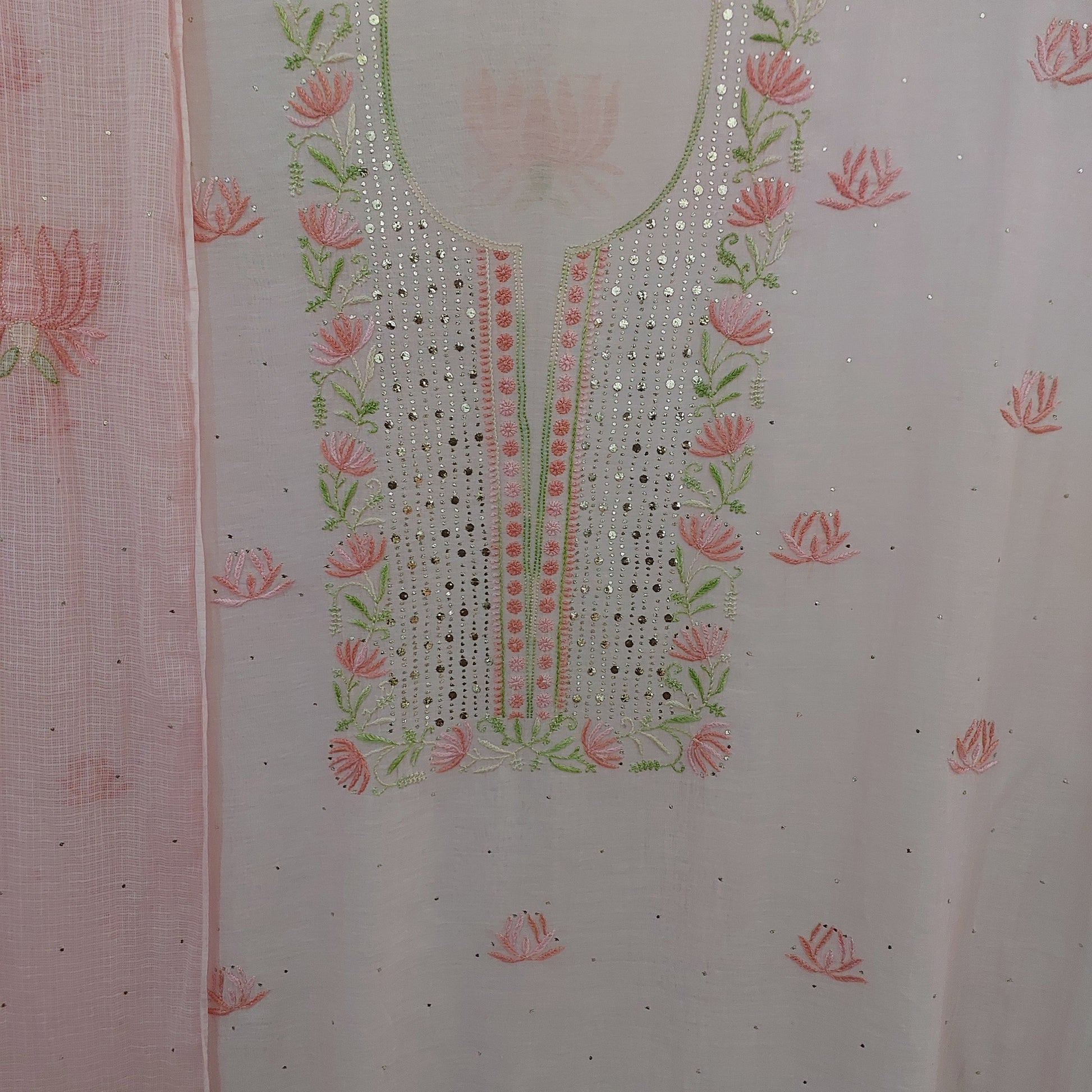 Pure mul chanderi chikankari kurta and kota doriya dupatta with mukaish embellishments. Bottom is dyed to same color, glaze cotton.