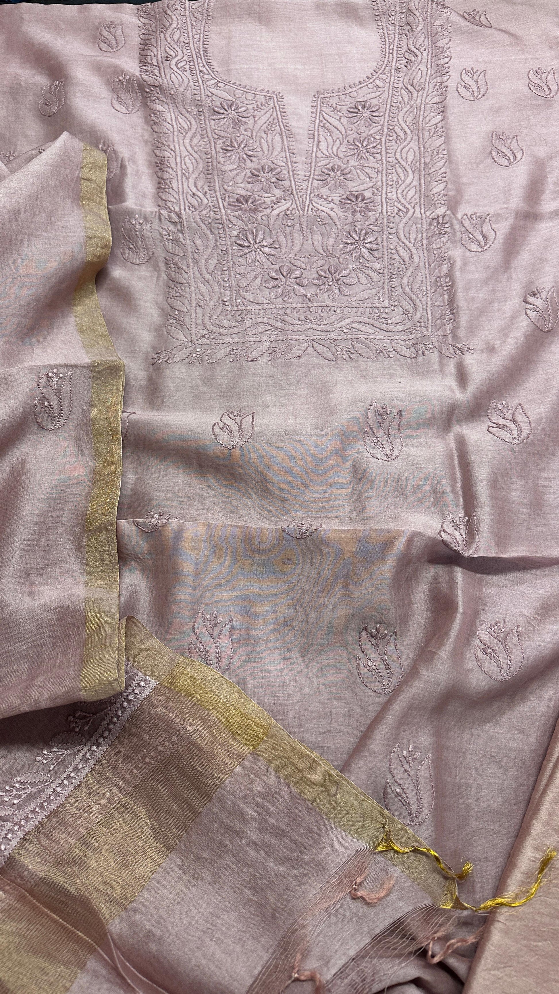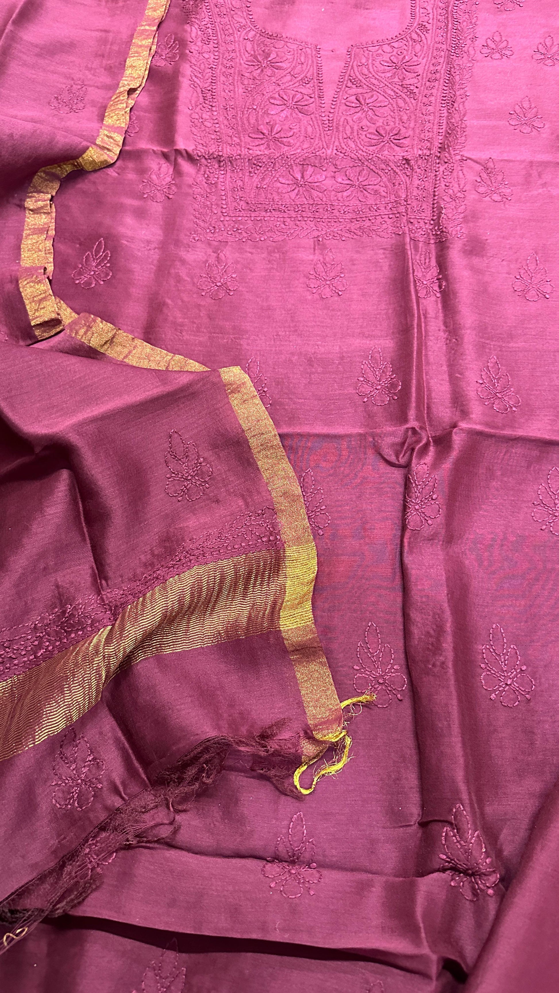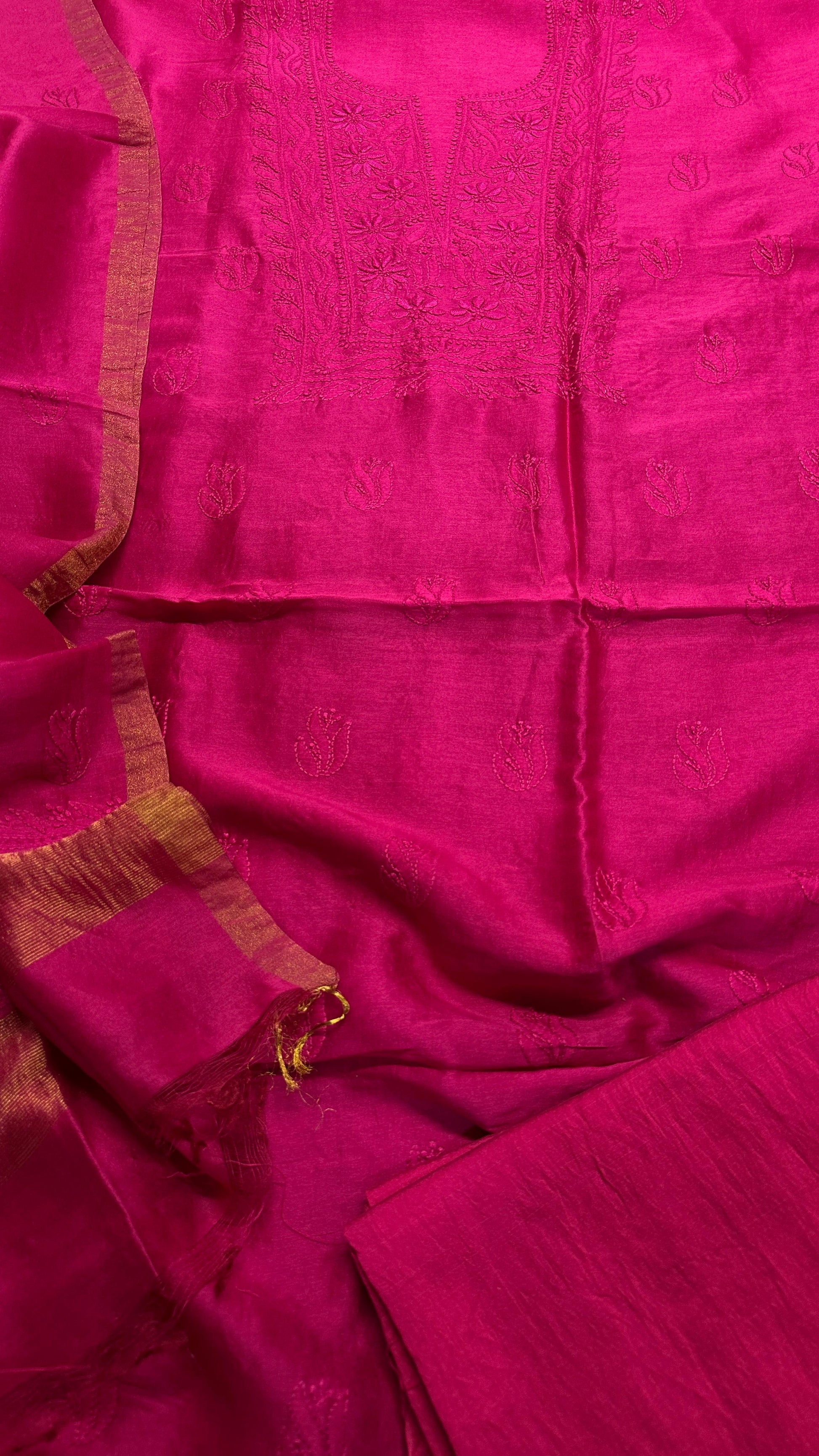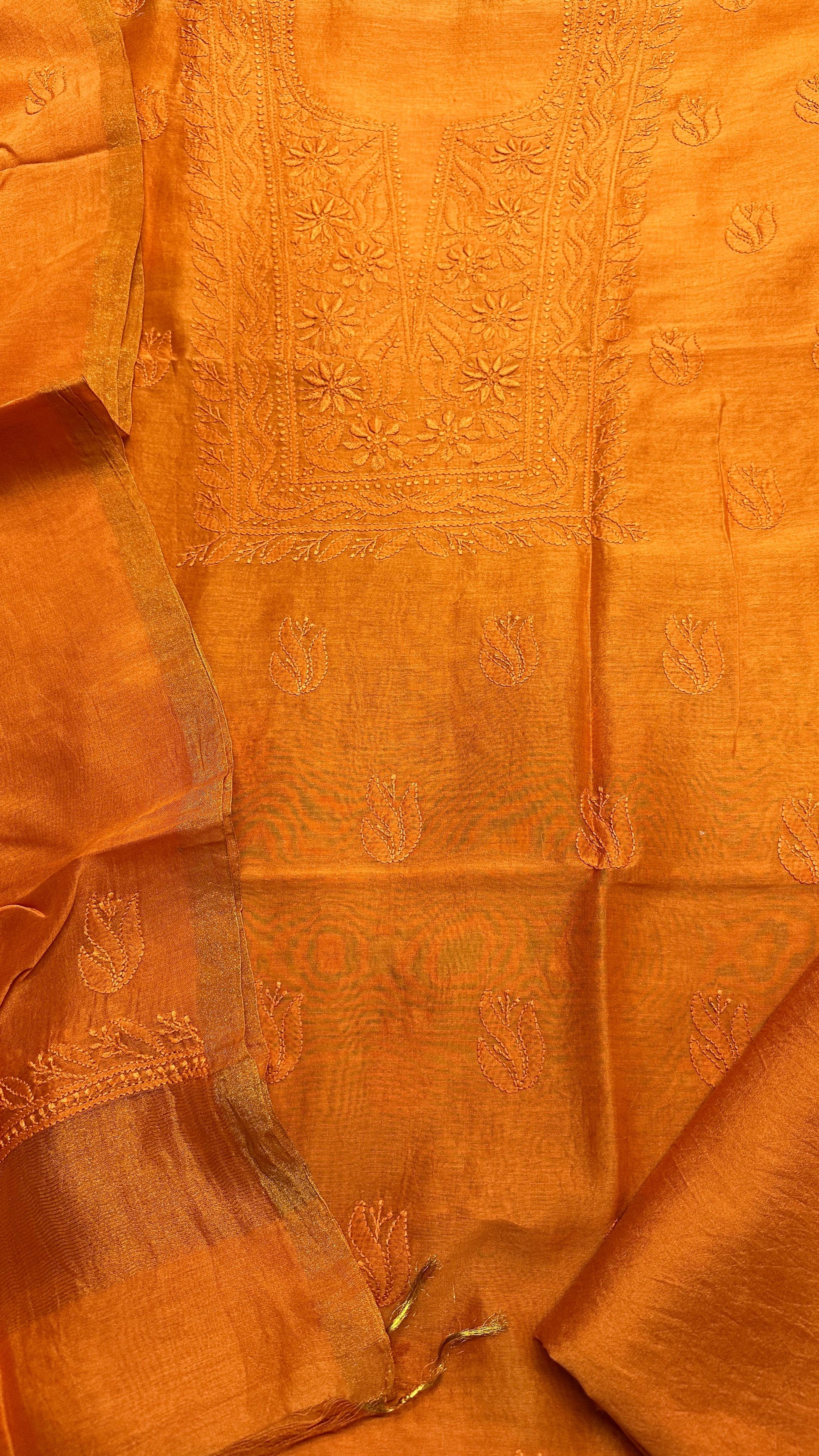 Unstitched pure chanderi silk chikankari set with bottom. Dupatta has oure tissue palla. You can place your order here and share the selected color on instagram dm or whats app 99100 37837.