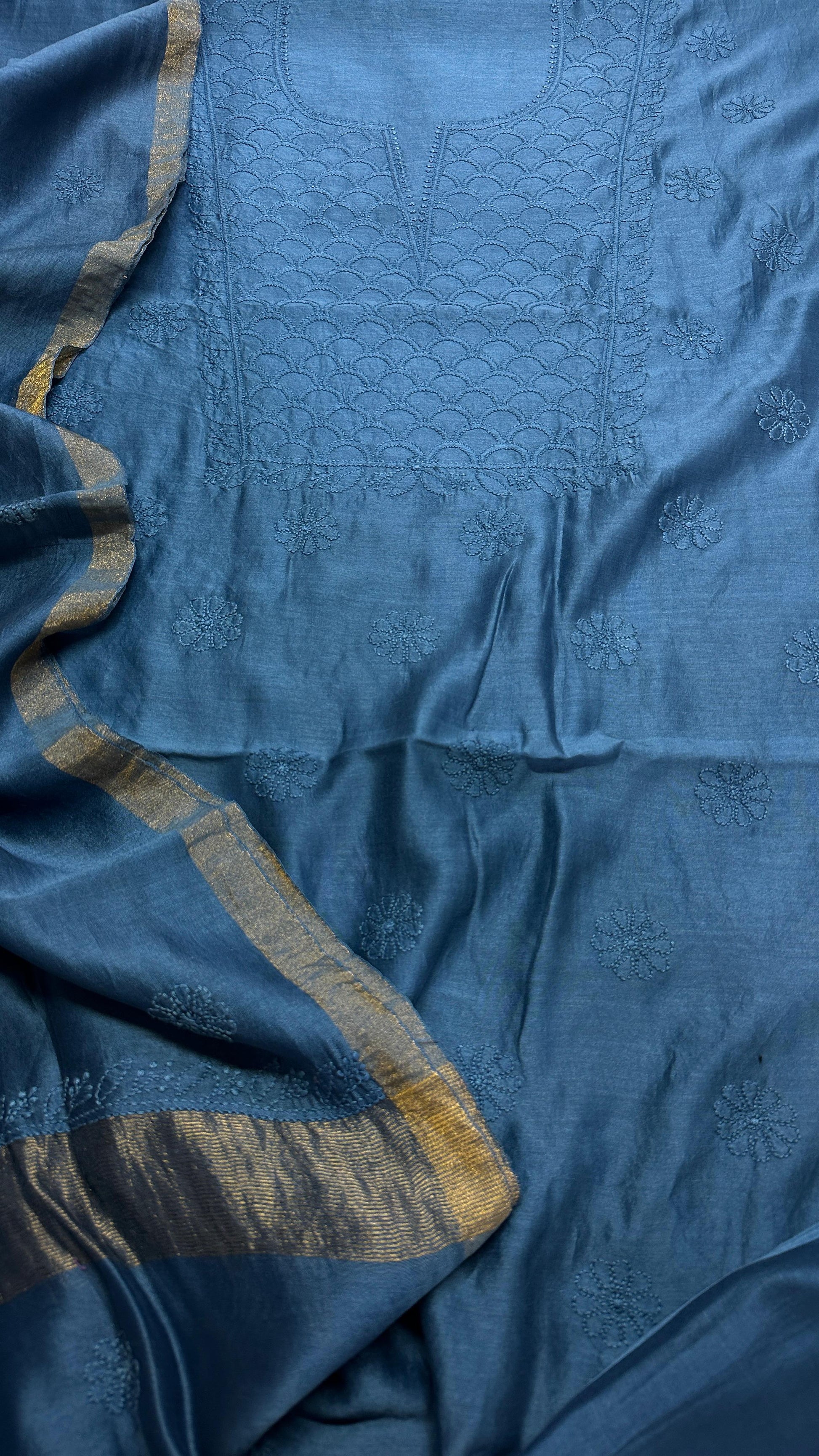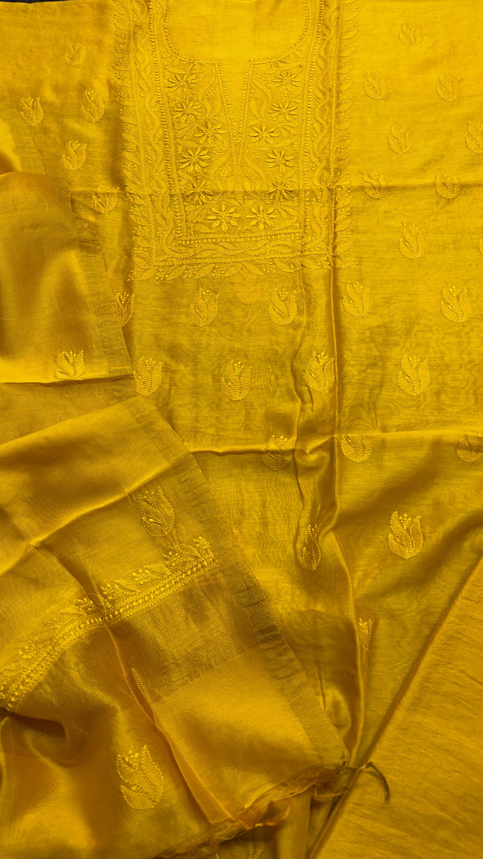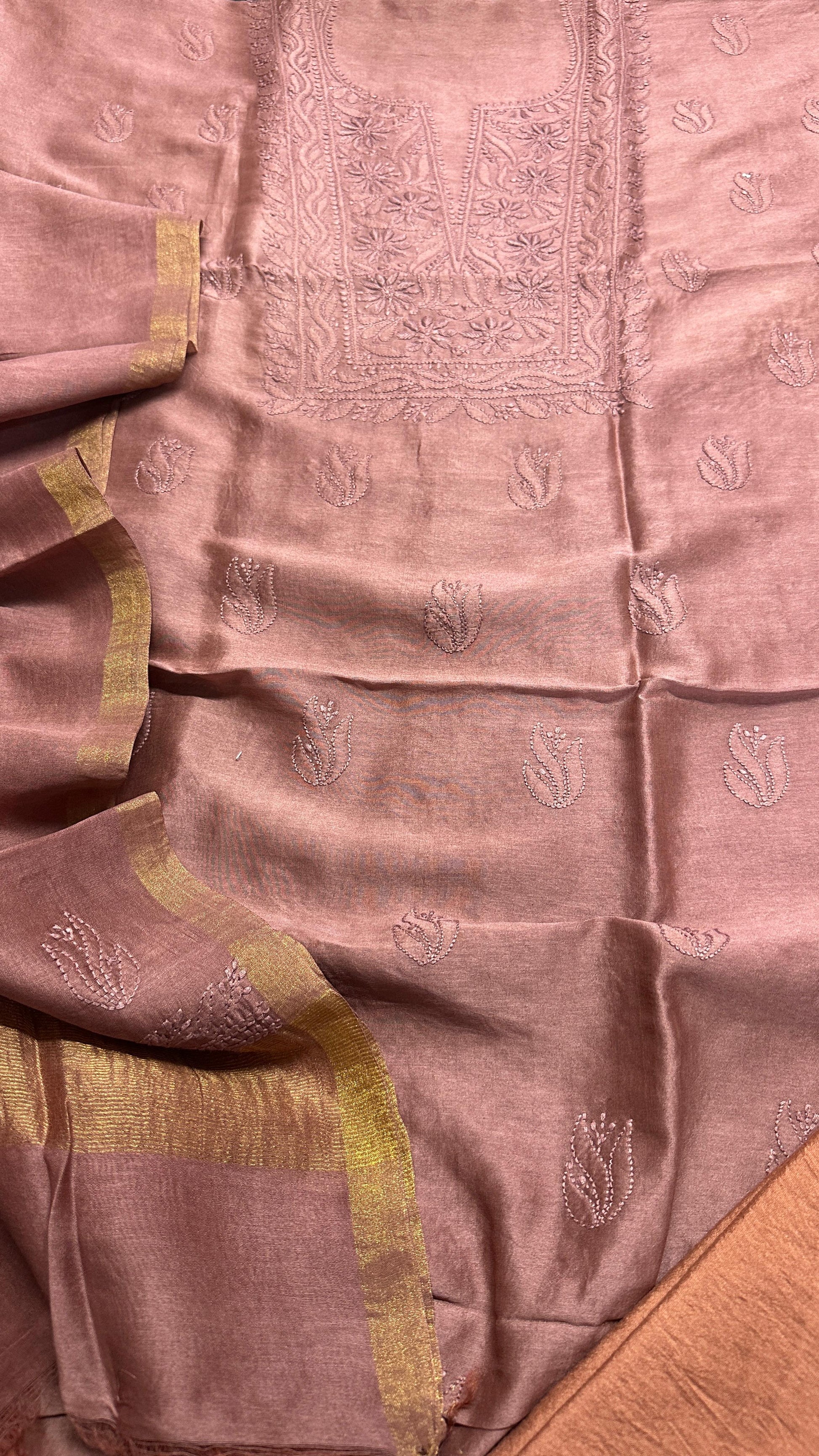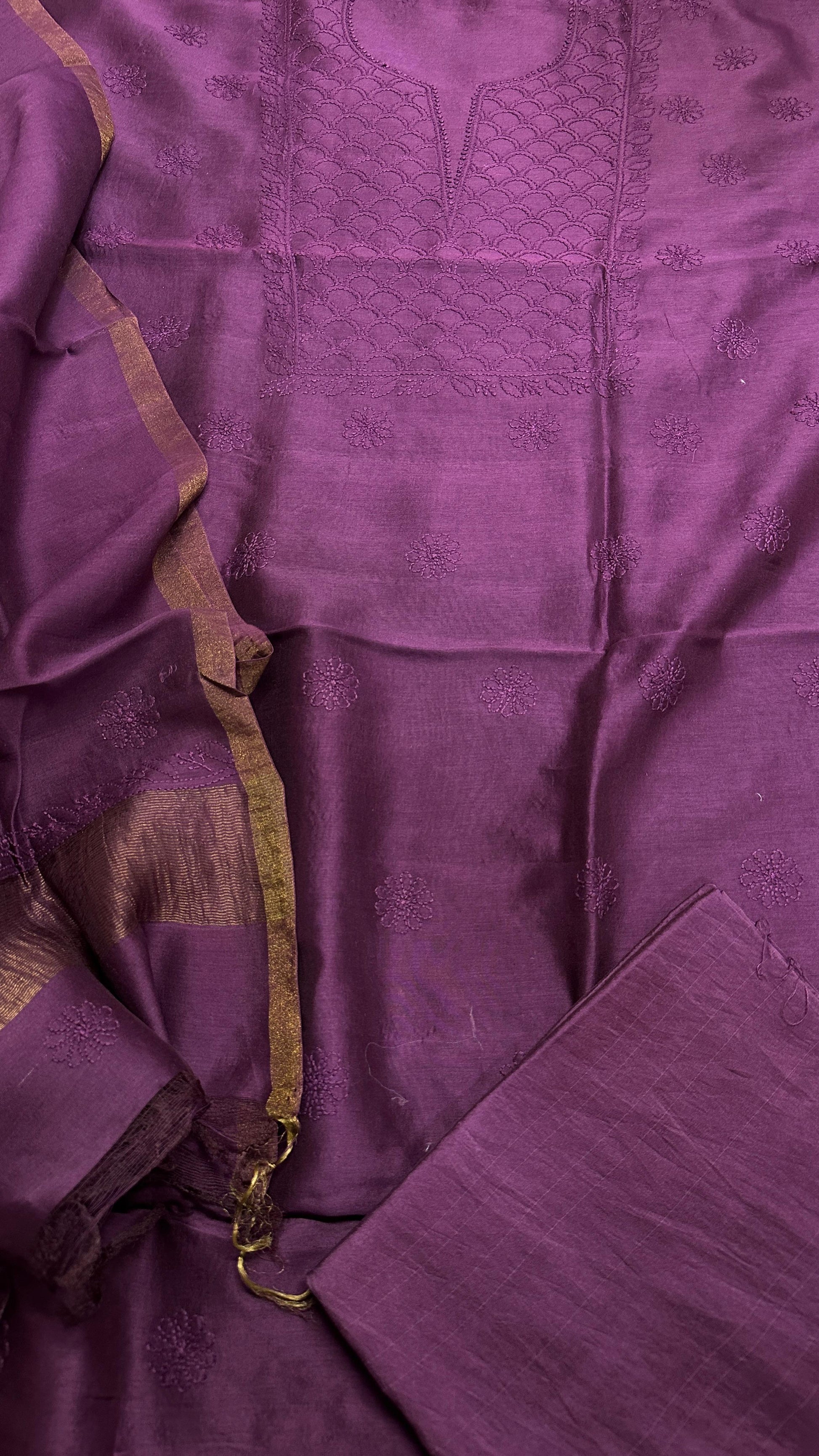 Unstitched pure chanderi silk chikankari set with bottom. Dupatta has oure tissue palla. You can place your order here and share the selected color on instagram dm or whats app 99100 37837.