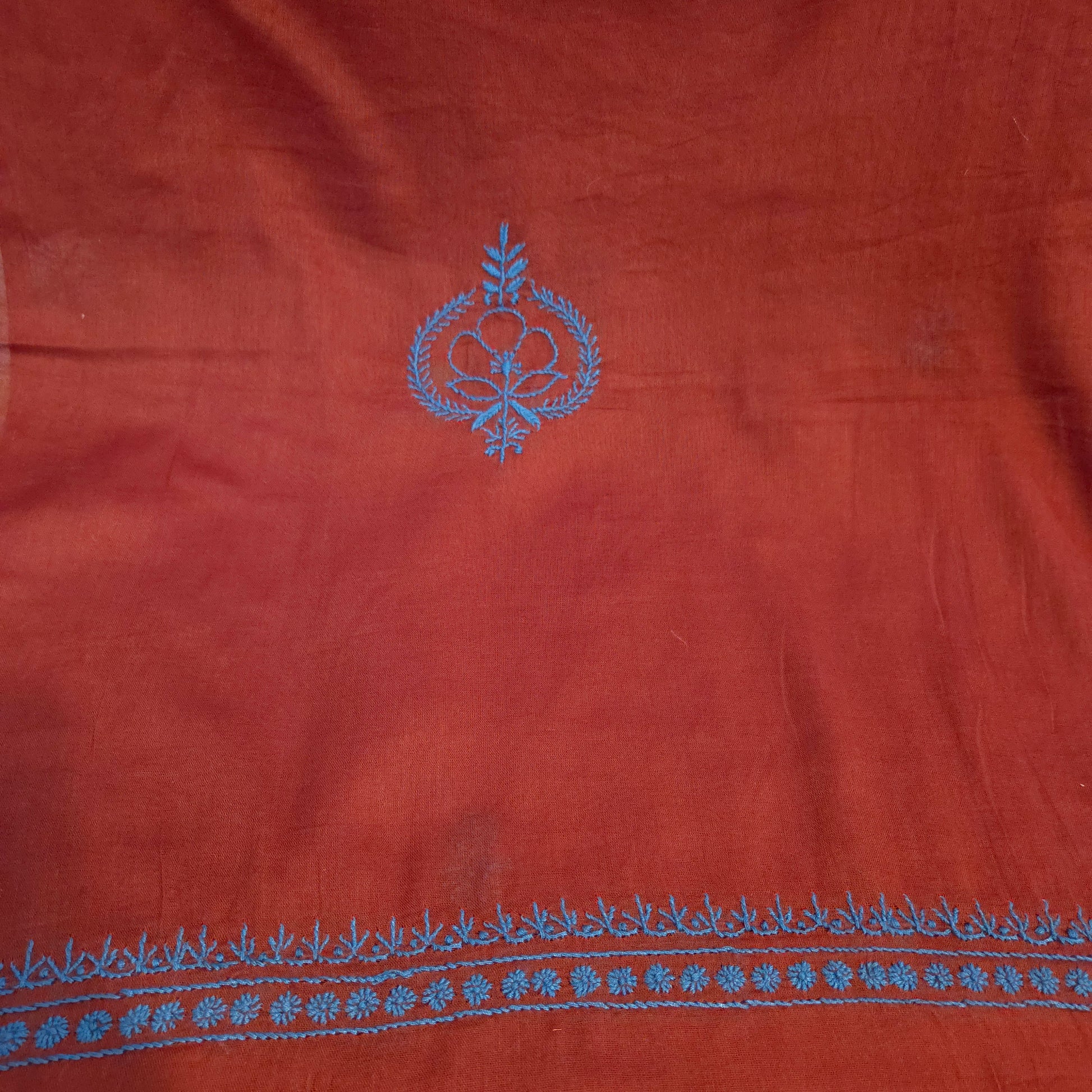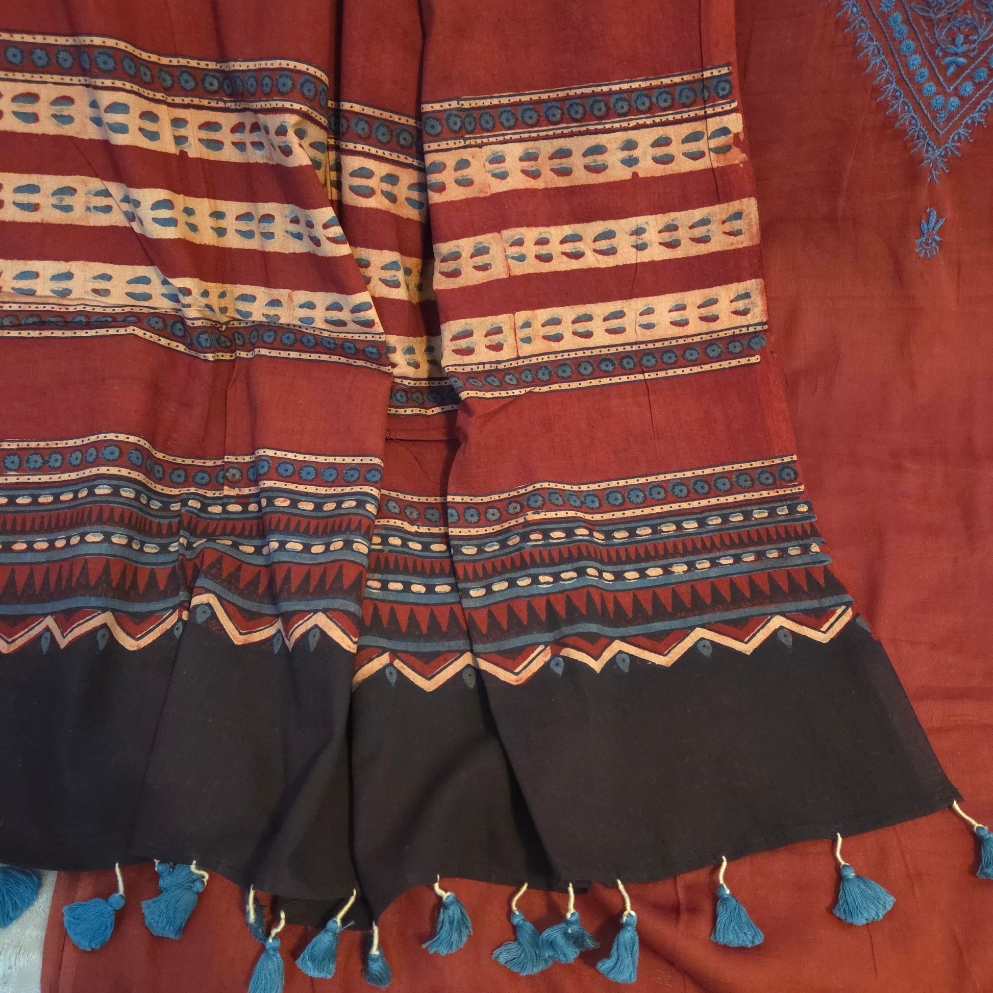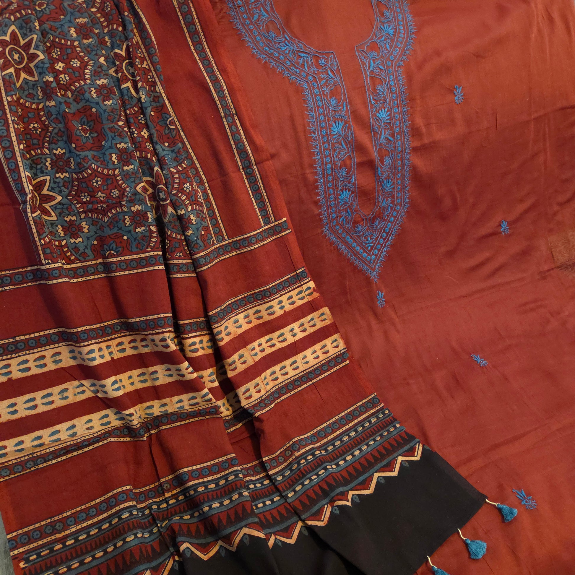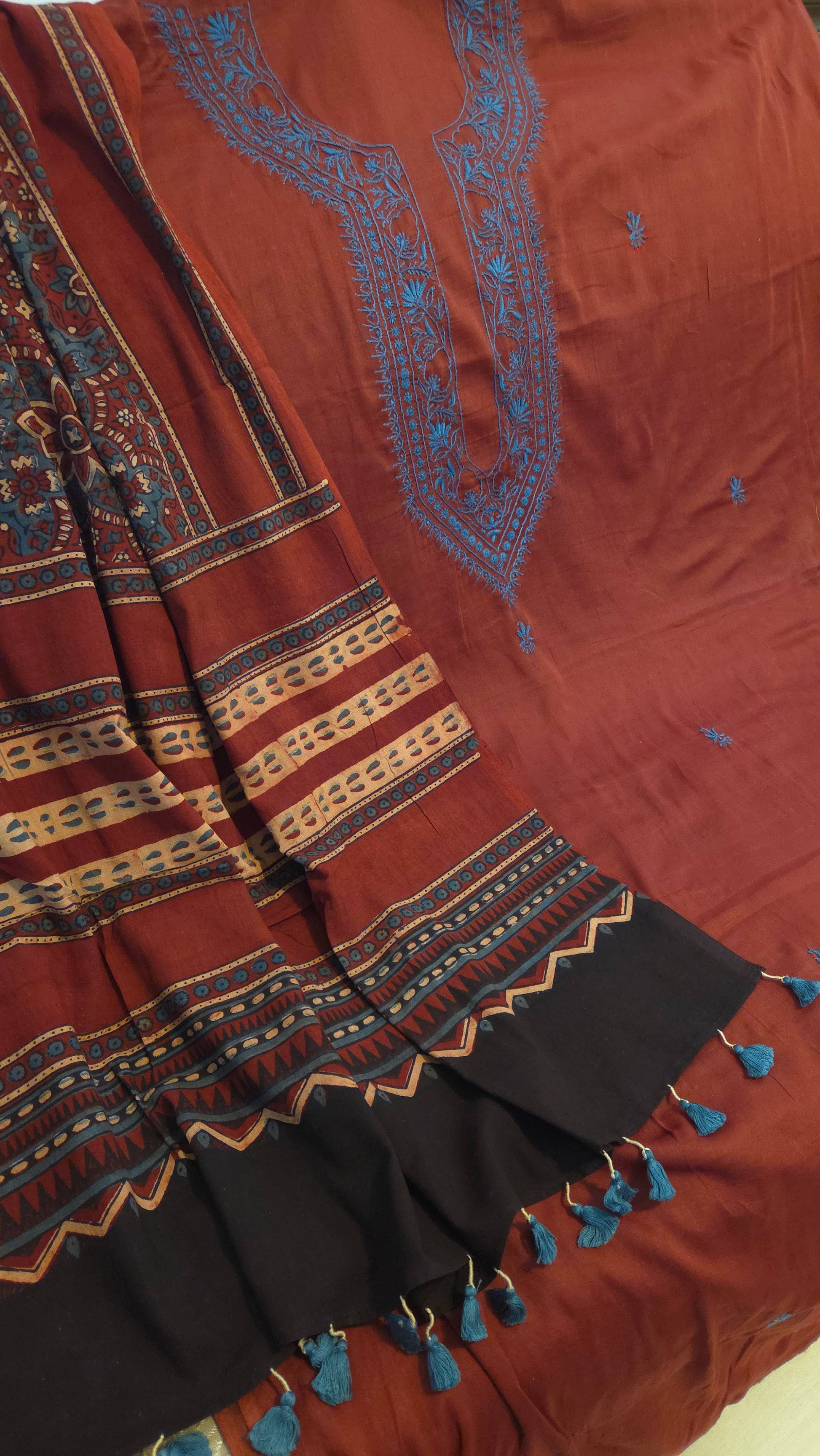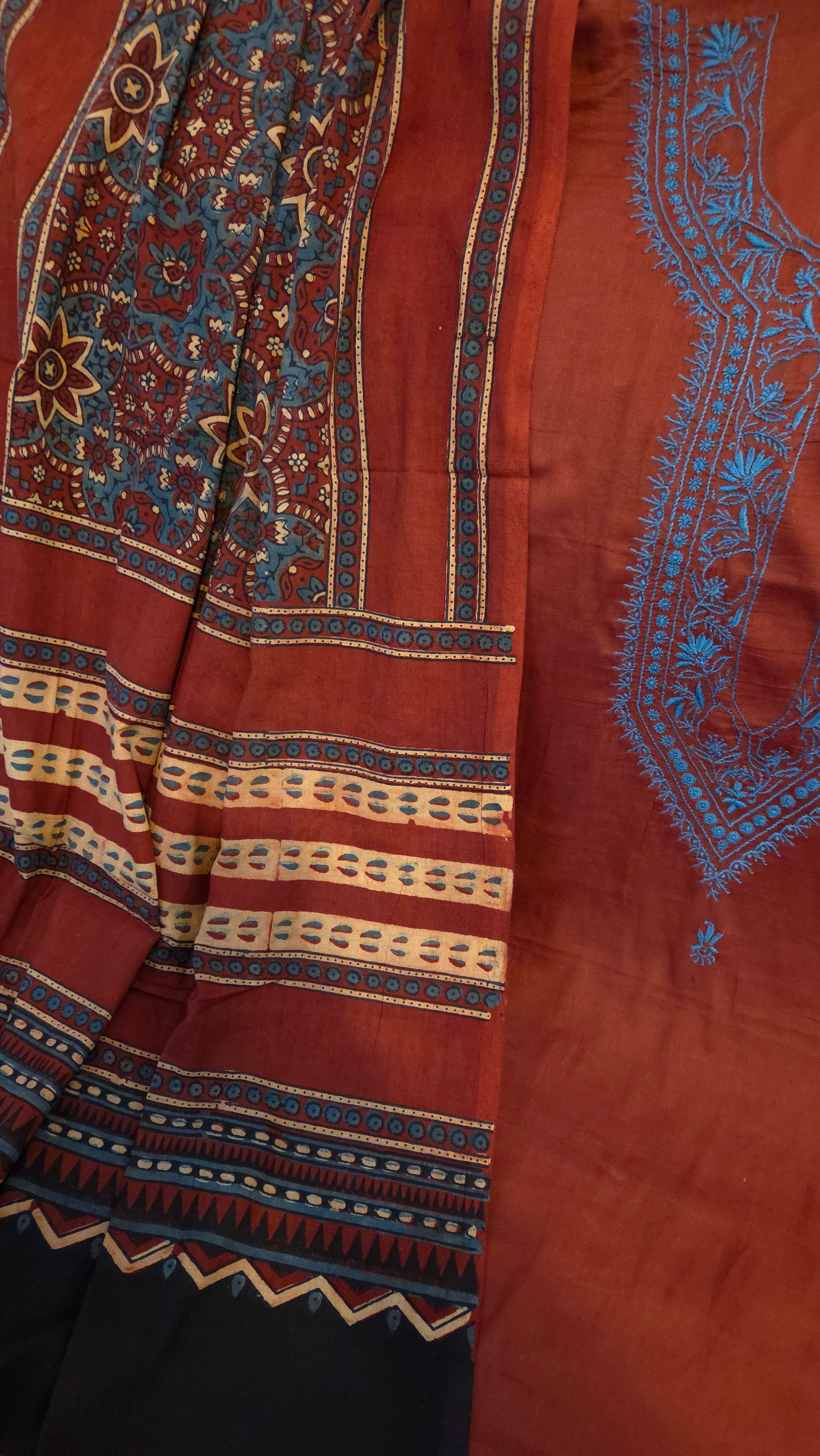 Unstitched mul cotton chikankari kurta with pure cotton ajrakh handblock dupatta. A fusion with earthy tones, trendy and classy at the same time.